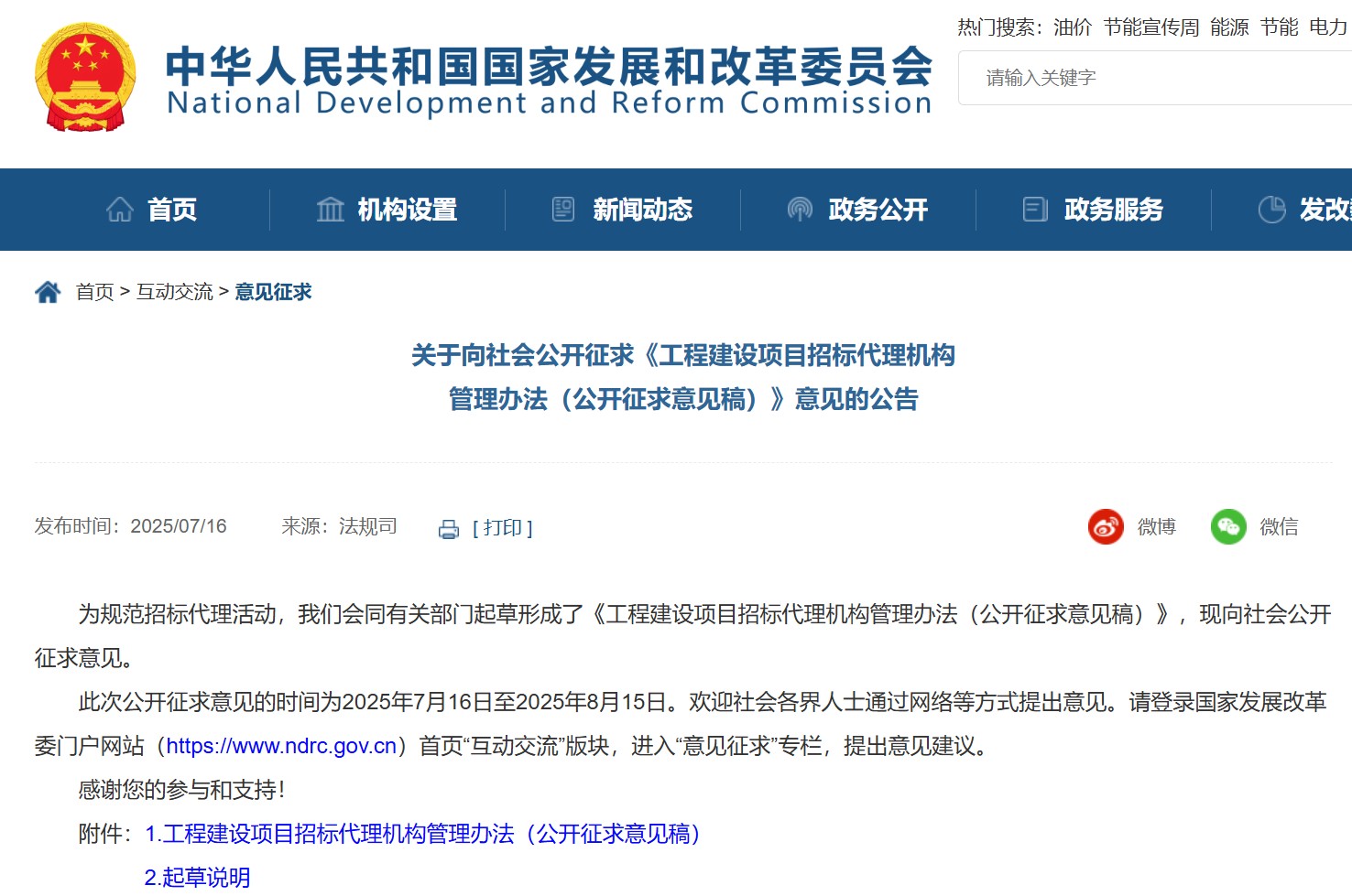 國家發(fā)展和改革委員會向社會公開征求《工程建設項目招標代理機構管理辦法(公開征求意見稿)》意見